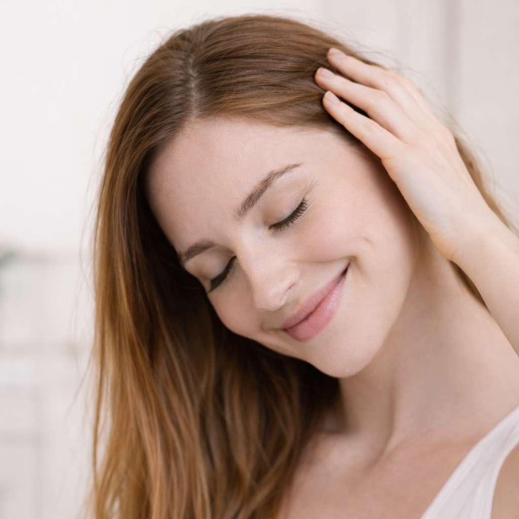 Pasa la bola aplicadora sobre el cuero cabelludo. Presiona suavemente para liberar el producto mientras masajeas y distribuyes de forma uniforme.